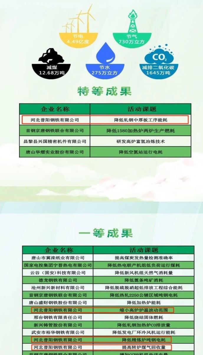? ? ? 本次征集活動,堅持全員參與、注重實效、促進(jìn)交流的原則,采用自主申報、推薦等方式,共征集業(yè)績成果169項,主要涉及節(jié)能、節(jié)水、二氧化碳和重點(diǎn)污染物減排等方面,經(jīng)行業(yè)專家評審,評出特等成果4項,一等成果30項,二等成果45項。其中,河北普陽鋼鐵有限公司(以下簡稱“普陽”)提交的降低軋鋼中厚板工序能耗課題獲評特等成果,縮小高爐爐溫波動范圍、降低精煉爐噸鋼電耗以及提高轉(zhuǎn)爐煤氣回收量3項課題被評為一等成果。據(jù)不完全統(tǒng)計,本次評定的成果應(yīng)用經(jīng)濟(jì)效益可達(dá)3.63億元/年。年節(jié)電4.49億kWh、節(jié)氣730萬m3、減煤12.68萬t、壓采地下水275萬m3、減排CO21645萬噸,大幅削減重點(diǎn)污染物排放。