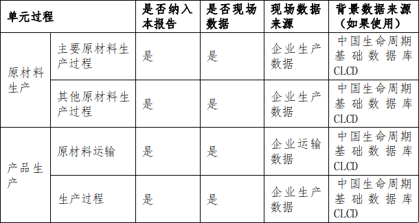 ? 本報(bào)告對(duì)系統(tǒng)邊界的所有過程進(jìn)行清單分析,包括所有能源、原材料和主要輔材的輸入,大氣、水體和固廢的排出等,部分消耗?量小于總消耗量?0.1%的輔材本報(bào)告中予以忽略?,F(xiàn)場數(shù)據(jù)均為本公司近?1?年內(nèi)的有效數(shù)據(jù)平均,背景數(shù)據(jù)以代表本國生產(chǎn)平均的數(shù)據(jù)優(yōu)先進(jìn)行采集。