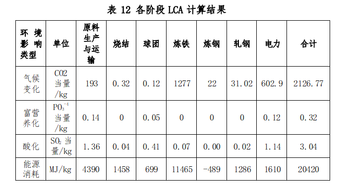 壓力容器用鋼板生命周期各個(gè)階段氣候變化、富營養(yǎng)化、酸化、能源消耗?LCA?指標(biāo)值如下表?12?所示。