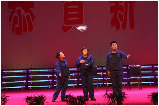 小品《選舉》將“6S”現(xiàn)場(chǎng)管理與“說學(xué)逗唱”巧妙地融為一體,諷刺了個(gè)別單位在選舉勞模時(shí)的“暗箱操作”,的做法,最終以公平、公正贏得了大家的一致認(rèn)可。這個(gè)節(jié)目很接“地氣”,可謂是“寓教于樂”意義深遠(yuǎn)?!短珮O響扇》動(dòng)作優(yōu)美、柔中帶剛。《新貴妃醉酒》讓大家體會(huì)了一把“夢(mèng)回唐朝”。紅遍全球的“騎馬舞”《江南Style》以其激昂的音樂和動(dòng)感的舞姿,讓全廠的觀眾都“嗨”了起來(lái)。豫劇聯(lián)唱?jiǎng)t讓愛好戲曲的朋友過了把戲癮。《夫妻情》的創(chuàng)意別具匠心,4對(duì)平凡的普陽(yáng)“小兩口”登上舞臺(tái)與大家見面,顯現(xiàn)了企業(yè)繁榮興旺、家庭和諧幸福。隨后,晚會(huì)在歌舞聯(lián)唱《東西南北大拜年》中落下帷幕。