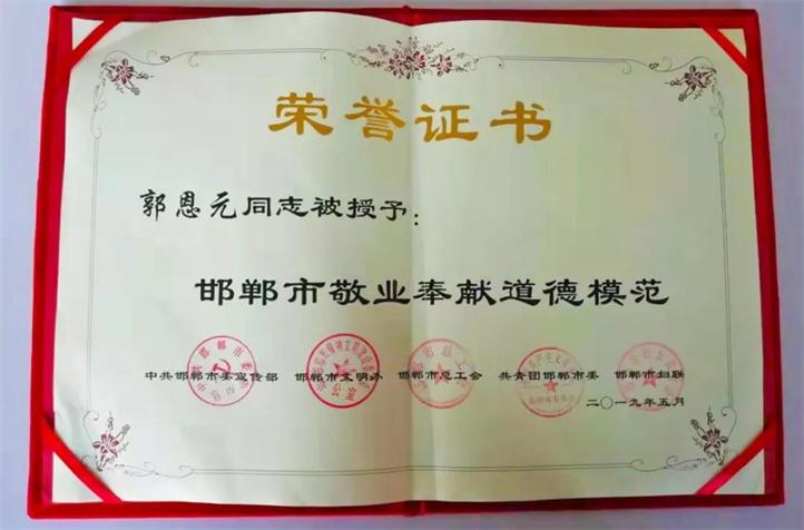近日,由邯鄲市委宣傳部、市文明辦、市總工會、團市委、市婦聯(lián)聯(lián)合舉辦的“邯鄲市第七屆道德模范頒獎典禮暨2019年度新時代好少年先進事跡發(fā)布會”,在市廣播電視臺演播大廳舉行。會議表彰了對推進全市精神文明建設做出突出貢獻的企事業(yè)單位和個人,全國十大杰出企業(yè)家、全國鋼鐵工業(yè)勞動模范、普陽鋼鐵集團黨委書記、董事長郭恩元榮獲“邯鄲市敬業(yè)奉獻道德模范”榮譽稱號。