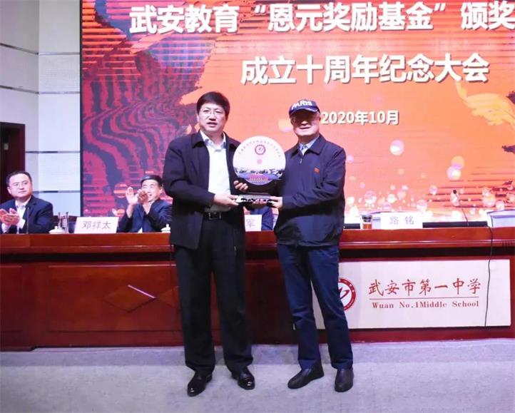 10月20日下午,武安教育“恩元獎勵基金”頒獎暨基金成立十周年紀念大會在武安第一中學舉行。武安市委副書記路銘出席大會,并親自向普陽集團黨委書記、基金發(fā)起人郭恩元頒發(fā)十周年紀念品。