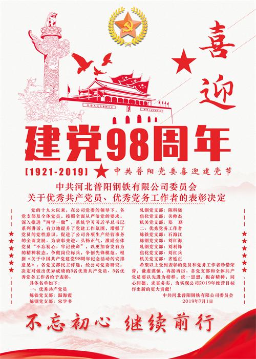 黨的十九大以來,在公司黨委的領(lǐng)導(dǎo)下,各黨支部及全體黨員,按照全面從嚴(yán)治黨的要求,深入推進(jìn)“兩學(xué)一做”,系統(tǒng)學(xué)習(xí)習(xí)近平總書記系列講話,有力地提升了黨建工作氛圍,增強(qiáng)了黨員的黨性意識(shí),促進(jìn)了公司各項(xiàng)生產(chǎn)經(jīng)營事務(wù)的全面發(fā)展。為表彰先進(jìn)、弘揚(yáng)正氣,激勵(lì)全體黨員“不忘初心、牢記使命”,以更加奮發(fā)有為的精神狀態(tài),爭做崗位標(biāo)兵,爭創(chuàng)先鋒模范,根據(jù)《關(guān)于中國共產(chǎn)黨建黨98周年紀(jì)念活動(dòng)的安排意見》,各黨支部民主評(píng)選,經(jīng)公司黨委研究,決定對(duì)做出優(yōu)異成績的5名優(yōu)秀共產(chǎn)黨員、5名優(yōu)秀黨務(wù)工作者給予表彰。