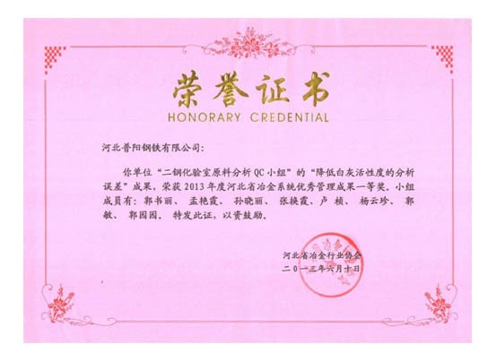QC小組課題獲得了一等獎8個,二等獎3個的好成績,同時公司榮獲“2013年度河北省冶金行業(yè)質(zhì)量管理小組活動優(yōu)秀企業(yè)”的稱號。